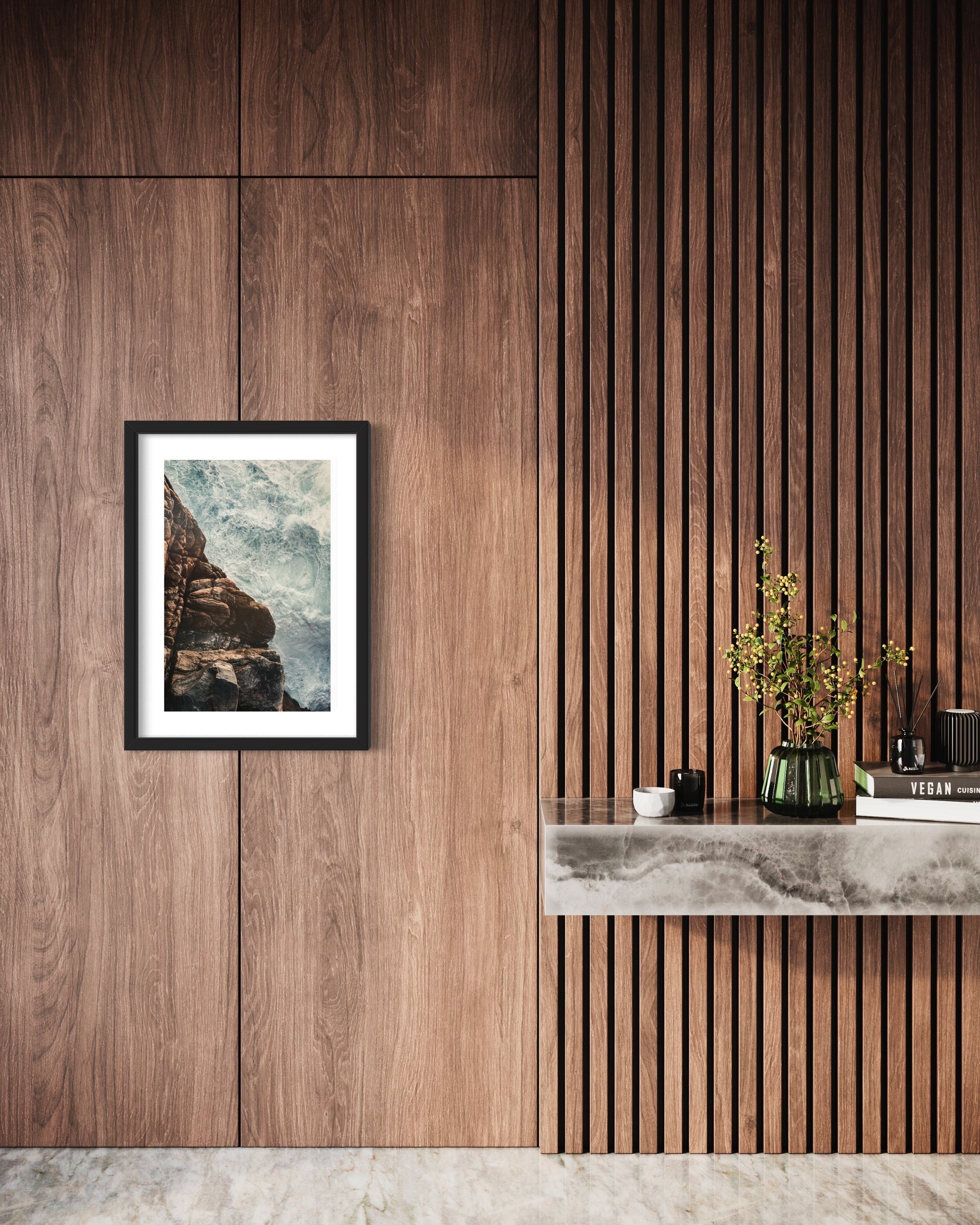 Framed option sits behind white matt board and 2mm glass within a 30mm frame.